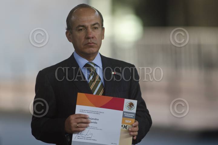 MÉXICO, D.F., 21JULIO2011.- Felipe Calderón Hinojosa, presidente de México, encabezó la entrega de reconocimientos del Concurso de la Olimpiada del Conocimiento Infantil 2011. Ésto se realizó en el Museo Nacional de Antropología e Historia. FOTO: MISAEL VALTIERRA/CUARTOSCURO.COM