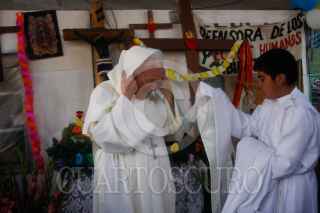 MÉXICO, D.F., 25JULIO2011.- Raúl vera, obispo de la diócesis de Saltillo, ofició una misa en el campamento del movimiento 26 de julio que se opone a la construcción de la Supervía Poniente. Lo anterior, en el marco de las festividades por el aniversario del movimiento. FOTO: IVAN STEPHENS/CUARTOSCURO.COM