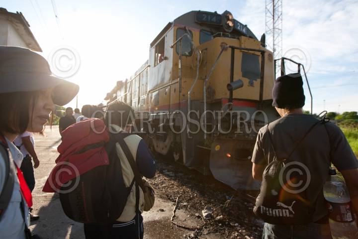 TENOSIQUE, TABASCO, 26JULIO2011.- Migrantes centroamericanos se suben a la "Bestia" para iniciar la denominada caravana "Paso a Paso Hacia la Paz. Al menos un centenar de condicionales de Guatemala, El Salvador y Honduras buscan cumplir su sueño americano llevando como guía al fray Tomas Gonzalez y diversas organizaciones no gubernamentales promigrantes. FOTO: MARCO POLO GUZMÁN HERNÁNDEZ/CUARTOSCURO.COM
