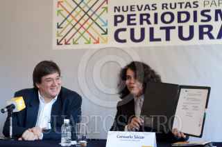 MÉXICO, D.F., 26JULIO2011.- Jaime Abello, presidente de la Fundación Nuevo Periodismo, y Consuelo Saizár, presidenta del Consejo Nacional para la Cultura y las Artes, firmaron un convenio para la creación del seminario "Nuevas Rutas para el Periodismo Cultural", en la sede del CONACULTA. FOTO: MOISÉS PABLO/CUARTOSCURO.COM