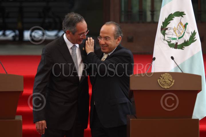 MÉXICO, D.F., 27JULIO2011.- Alvaro Colom, presidente de Guatemala y el presidente Felipe Calderón al termino de un mensaje a los medios de comunicación que se realizo en las escalinatas de las residencia oficial de Los Pinos. FOTO: RODOLFO ANGULO/CUARTOSCURO.COM