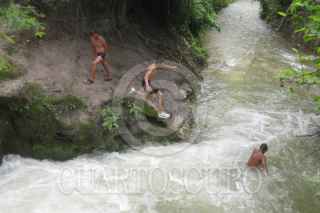 HUACAPA, GUERRERO, 27JULIO2011.- Un grupo de niños se divierten aventandose clavados en el cauce del rio Huacapa, aprovechando el desfogue de agua en la presa "Cerrito Rico", que llevan a cabo autoridades municipales con la finalidad de evitar alguna contingencia. FOTO: OSCAR ALVARADO/CUARTOSCURO.COM