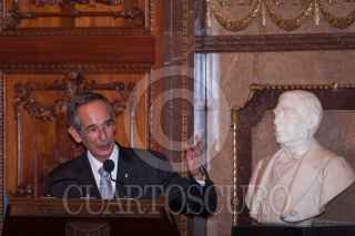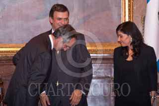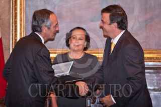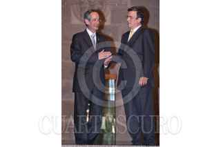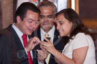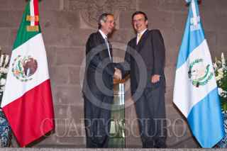 MÉXICO, D.F., 27JULIO2011.- Álvaro Colom Caballeros, presidente de Guatemala, recibió de manos de Marcelo Ebrard Casaubón, jefe de Gobierno del Distrito Federal, la llave y un pergamino que lo acreditan como Huésped Distinguido de la ciudad de México, en el salón de Cabildos del Antiguo Palacio del Ayuntamiento. FOTO: ISAAC ESQUIVEL/CUARTOSCURO.COM