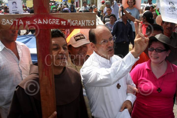 COATZACOALCOS, VERACRUZ., 29JULIO2011.- Cientos de migrantes centroamericanos recorrieron las principales calles de esta ciudad, acompañados del sacerdote defensor, Alejandro Solalinde Guerra, en donde exigieron a las autoridades de los tres niveles de gobierno y a la delincuencia organizada frenaran las agresiones y secuestros en su contra, la protesta se llevó a cabo en el marco de la caminata Paso a Paso por la Paz. FOTO: FÉLIX MÁRQUEZ/CUARTOSCURO.COM