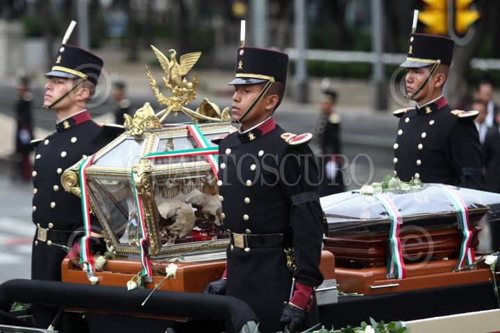 MÉXICO, D.F., 30JULIO2011.- Un cortejo fúnebre trasladó los restos mortales de los Héroes de la Independencia: Miguel Hidalgo, Ignacio Allende, Juan Aldama, Mariano Jiménez, José María Morelos, Nicolás Bravo, Vicente Guerrero, Guadalupe Victoria y Leona Vicario, entre otros, de Palacio Nacional al Ángel de la Independencia en donde descansarán de nuevo en el mausoleo del Ángel, que fue remodelado y acondicionado. FOTO: ALFREDO GUERRERO/CUARTOSCURO.COM