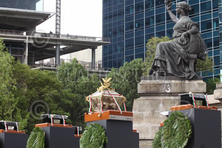 MÉXICO, D.F., 30JULIO2011.- Un cortejo fúnebre trasladó los restos mortales de los Héroes de la Independencia: Miguel Hidalgo, Ignacio Allende, Juan Aldama, Mariano Jiménez, José María Morelos, Nicolás Bravo, Vicente Guerrero, Guadalupe Victoria y Leona Vicario, entre otros, de Palacio Nacional al Ángel de la Independencia en donde descansarán de nuevo en el mausoleo del Ángel, que fue remodelado y acondicionado. FOTO: ALFREDO GUERRERO/CUARTOSCURO.COM