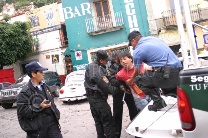 Guanajuato, Guanajuato,09OCT2004.- Elementos de seguridad del este estado se llevan a una persona en estado de briedad en las calles del centro en donde se lleva las actividades del 32 festival Cervantino. FOTO:Eunice Adorno–CUARTOSCURO.COM