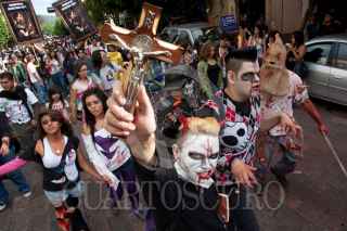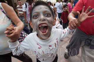 QUERÉTARO, QUERÉTARO, 30JULIO2011.- ZombieWalk 2011 en la ciudad de Querétaro, en el que participaron más de mil personas caracterizadas de zombies. Esta caminata se lleva a cabo una vez al año y tiene como finalidad hacer un homenaje a los personajes del cine, llamados zombies o muertos vivientes que han sido parte importante de la literatura, cine, comics de los años 50 y que en la actualidad en los juegos de vídeo también son parte importante. El primer zombie walk se llevó acabo en Toronto, Canadá en la década de los 90. FOTO: DEMIAN CHÁVEZ/CUARTOSCURO.COM