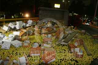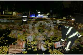 MÉXICO, D.F. 02AGOSTO2011.- Un camión con nueve toneladas de guayabas volcó esta madrugada sobre el Circuito Interior Río Churubusco a la altura de la Calzada La Viga lo que obligó al cierre con dirección al sur por más de cuatro horas. FOTO: LM ACEVEDO/CUARTOSCURO.COM