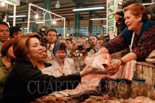 Maria Teresa Uriarte esposa del abanderado presidencial del PRI , aprovecho el recorrido de su marido que realizo en el mercado de San Juan, para escoger unos mariscos para esta semana santa.