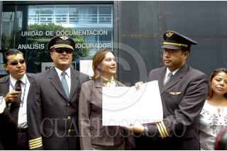 MÉXICO, D.F., 04AGOSTO2011.- El Capitán, Luis Ojeda y la Sobrecargo Ivette Lizardi, ambos trabajadores de Mexica acudieron a las instalaciones de la PGR, donde presentaron una denuncia penal por fraude y lo que resulte en contra de Andrés Conesa, socio administrador del grupo Cintra-Mexicana, esto la supuesta venta ilícita de bienes y activos de la empresa aérea, situación que dejó en posibilidad de quiebra a Mexicana de Aviación. FOTO: IVAN MÉNDEZ/ CUARTOSCURO.COM