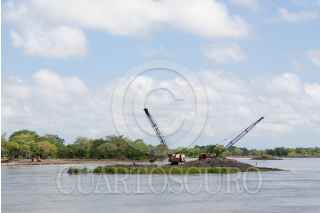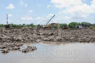 NACAJUCA, TABASCO, 04AGOSTO2011.- Maquinaria pesada laboran a marcha forzada sobre las aguas y orillas del desbordado río Mezcalapa, el cual ya hace daño en varias comunidades indígenas chontales. Muchos de los habitantes manifiestan que han perdido parcelas de siembras y semovientes con sus crías. FOTO: MARCO POLO GUZMÁN HERNÁNDEZ/CUARTOSCURO.COM