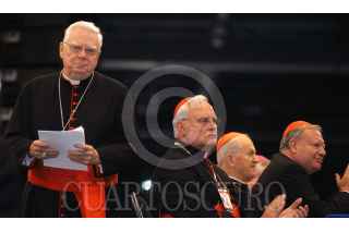 GUADALAJARA,JALISCO 11OCTUBRE2004.- Con una ceremonia de bienvenida en la Expo Guadalajara, continúan los trabajos del Congreso Eucarístico. Bernad Law de la arquidiosesis de Boston camina al estrado, atras estan el cardenal Carlos Amigo Vallejo, Josef Tomko legado pontificio y el cardenal Juan Sandoval Iñiguez. FOTO: Germán Romero/CUARTOSCURO.COM