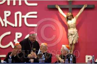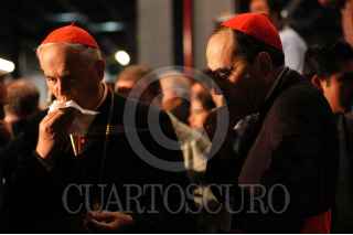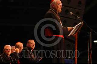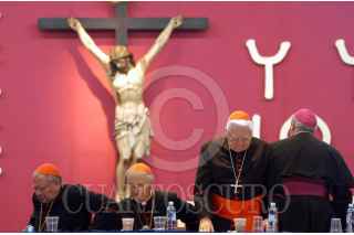 GUADALAJARA,JALISCO 11OCTUBRE2004.- Con una ceremonia de bienvenida en la Expo Guadalajara, continúan los trabajos del Congreso Eucarístico. El legado pontificio Josef Tomko y el cardenal José Luis Cipriani de arquidiosesis de Perú comen fruta durante un receso. FOTO: Germán Romero/CUARTOSCURO.COM