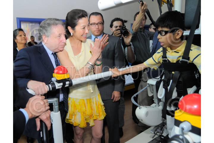 MÉXICO, D.F., 10AGOSTO2011.- Jean Todt, presidente de la Federacón Internacional de Automovilismo y su esposa, Michelle Yeoh, embajadora de la Década de Acción para la Seguridad Víal animan a un menor que recibe terapia en la "caminadora" del Centro de Rehabilitación Teletón sede Tlalnepantla. La visita tiene como fin estrechar la realciones entre instituciones que buscan el bienestar de la salud infantil. FOTO: FRANCISCO RODRÍGUEZ/CUARTOSCURO.COM