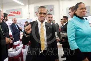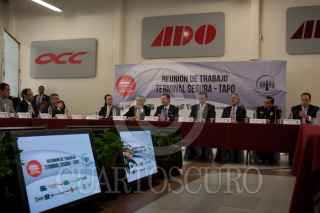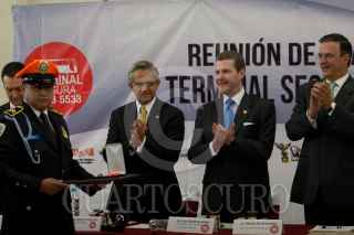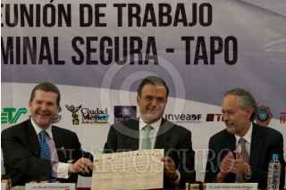 MÉXICO, D.F., 16AGOSTO2011.- Marcelo Ebrard, Jefe del Gobierno capitalino acompañado de Miguel Ángel Mancera Procurador del D.F., Luis Wertman Zaslav, Presidente del Consejo Ciudadano del D.F. y Juan Carlos Uriarte Amann, Presidente del Consejo de Administración de la Terminal TAPO, encabezo la firma y presentación del convenio Programa Terminal Segura, en las instalaciones de ADO. FOTO: GUILLERMO PEREA/CUARTOSCURO.COM