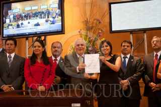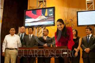 MÉXICO, D.F., 16AGOSTO2011.- Leticia Salas Torres Directora del Canal Del Congreso acompañad de Leticia Quezada, Diputada del PRD y Carlos Jiménez Gracia, Senador del PRI, realizaron la firma del convenio con representantes de diversos congresos estatales. FOTO: GUILLERMO PEREA/CUARTOSCURO.COM