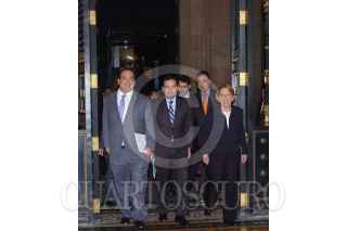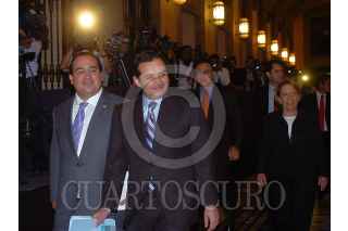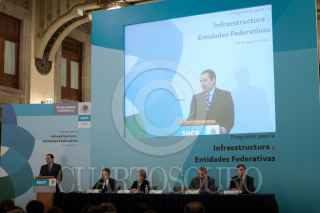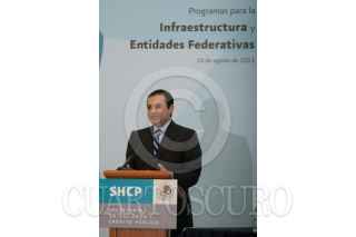 MÉXICO, D.F., 18AGOSTO2011.- Ernesto Cordero Arroyo, titular de la Secretaria de Hacienda y Crédito Público acompañado de Javier Duarte, Gobernador del Estado De Veracruz, Georgina Kessel, Directora de Banobras, durante la presentación de los Programas de Infraestructura y Entidades Federativas, en el Palacio Nacional. FOTO: GUILLERMO PEREA/CUARTOSCURO.COM