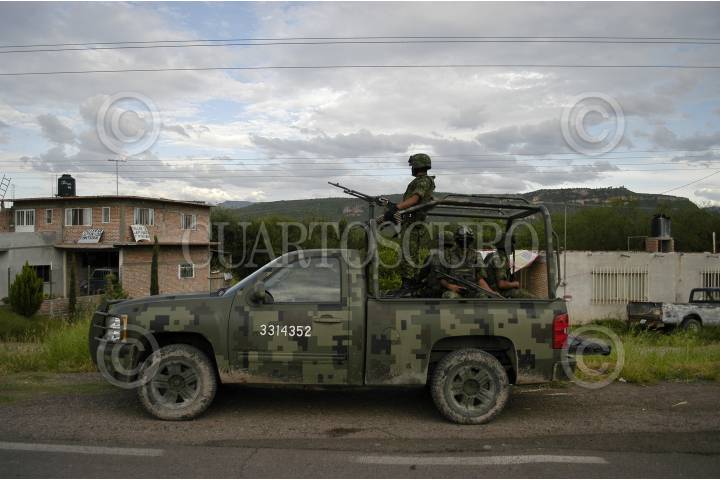 JALPA, ZACATECAS, 22AGOSTO2011.- Elementos del Ejército Mexicano realizan un reten en las entradas del municipio, minutos después de la persecución y enfrentamiento con presuntos miembros del crimen organizado en la comunidad de los Santiago y la carretera federal Zacatecas-Guadalajara. El saldo oficial del enfrentamiento fue de tres muertos, un efectivo militar y dos presuntos delincuentes. De acuerdo con el reporte levantado por la Procuraduría General de Justicia de Zacatecas, hay una persona detenida, que será puesta a disposición del Ministerio Público de la Federación. FOTO: CUARTOSCURO.COM