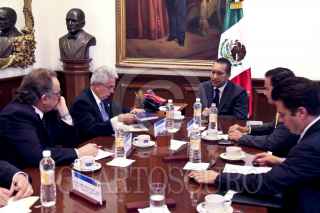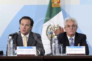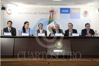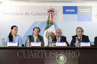 MÉXICO, D.F., 22AGOSTO2011.- Decio de María y Justino Compeán, secretario general y presidente de la Federación Mexicana de Fútbol (izquierda); Francisco Blake Mora, secretario de Gobernación (centro); Bernardo de la Garza, director general de la Comisión Nacional de Cultura Física y Deporte y Luis Cárdenas Palomino, coordinador de la División de Seguridad Regional de la Secretaría de Seguridad Pública Federal (derecha); se reunieron esta mañana en la sede de la Secretaría de Gobernación para dar seguimiento a los hechos suscitados el sábado pasado donde un grupo armado se enfrento a balazos con policías en las inmediaciones del Estadio Territorio Santos Modelo (TSM) lo que provocó crisis nerviosa entre los asistentes y la suspensión del partido Santos Monarcas. FOTO: ESPECIAL/CUARTOSCURO.COM