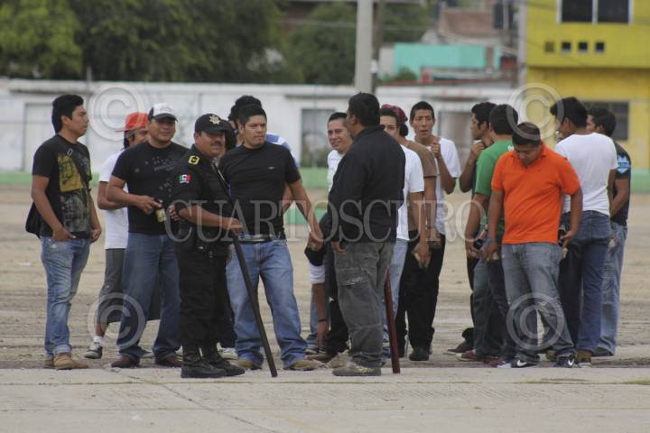 OAXACA, OAXACA, 23AGOSTO2011.- Un grupo de porros presuntamente contratados por el síndico municipal del ayuntamiento de Santa Lucía del Camino resguardaron las inmediaciones del estadio Benito Juárez, con lo que trataban de impedir la instalación de un grupo de comerciantes. Los porros fueron resguardados en todo momento por la policía municipal. Al arribo de la policía estatal se retiraron, entre las cosas que olvidaron se encontraron basucas caseras, estopa y un machete. FOTO: ARTURO PÉREZ ALFONSO/CUARTOSCURO.COM