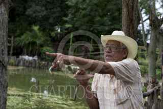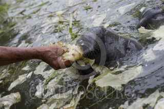 JONUTA, TABASCO, 25AGOSTO2011.- Don Valentín Ascencio de 70 años de edad mejor conocido como "El abuelo manatí" tiene un don de comunicación que mantiene con seis manatíes que ha creado desde hace mas de una década; les silba, les habla, los mima, alimenta y hasta los medicamenta cuando enferman. La única problemática es que ninguna autoridad ambientalista quiere hacerse cargo de estos mamiferos acuáticos, ya que teme que cuando él fallezca no haya quien se encargue de estos animales en peligro de extinción; Manatí proviene de la lengua indígena Caribe Con Tetas y su nombre científico es Trichechus manatus, del griego tri (tres) y Chechus (uñas), esta especie marina no poseen ningún enemigo natural sin embargo esta en vías de desaparición por su extinción debido a factores que amenazan la especie como su cacería para el consumo de su carne, contaminación de las aguas y redes de pesca desechadas en el agua que le producen la muerte al ahogarse. FOTO: MARCO POLO GUZMÁN HERNÁNDEZ/CUARTOSCURO.COM