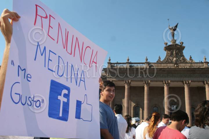 MONTERREY, NUEVO LEÓN, 28AGOSTO2011.- Habitantes de Monterrey se manifestaron a las afueras de palacio de gobierno, donde exigieron alto a la violencia que se vive en la región y clamaron la destitución del presidente de México Felipe Calderón Hinojosa, y el gobernador de Nuevo León Rodrigo Medina por los hechos ocurridos el pasado 25 de Agosto en el casino Royale donde un comando armado ataco dicha casa de apuestas y murieron 53 personas. FOTO: SAÚL LÓPEZ/CUARTOSCURO.COM