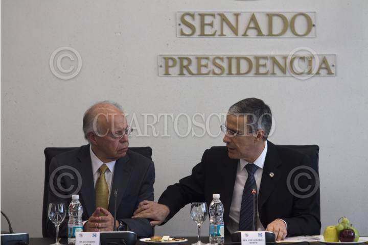 MÉXICO, D.F., 01SEPTIEMBRE2011.- Luis Raúl González Pérez, abogado general de la UNAM, José Narro Robles, rector de la UNAM, y José Goznález Morfín, presidente de la Mesa Directiva del Senado de la República, durante la reunión entre autoridades de la Máxima Casa de Estudios con los integrantes de la bancada panista de la Cámara Alta, esto para presentarle la propuesta que realizó un comité universitario para combatir la violencia e inseguridad que vive el país. . FOTO: MOISÉS PABLO/CUARTOSCURO.COM