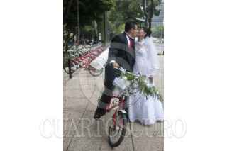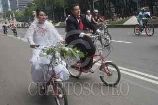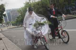 MÉXICO, D.F., 04SEPTIEMBRE2011.- Una pareja de recién casados festejó su enlace con un recorrido en ecobici por avenida Reforma durante el Paseo Ciclista este domingo. FOTO: ISAAC ESQUIVEL/CUARTOSCURO.COM
