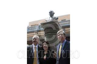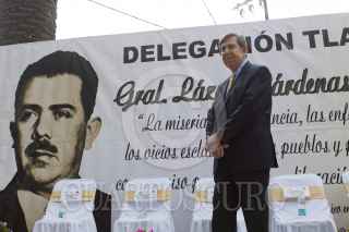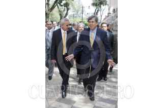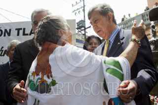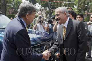 MÉXICO, D.F., 08SEPTIEMBRE2011.- Cuauhtémoc Cárdenas Sólorzano, integrante del PRD, saluda a Higinio Chávez, delegado de Tlapan, al llegar a la explanada delegacional en donde se realizó una ceremonia para develar un busto del General Lázaro Cárdenas del Río, ex-presidente mexicano quien nacionalizó la industria petrolera. FOTO: MOISÉS PABLO/CUARTOSCURO.COM