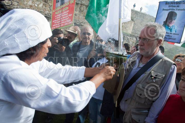 OAXACA, OAXACA, 12SEPTIEMBRE2011.- Victimas de la violencia que marcha con la caravana al Sur encabezada por el poeta Javier Sicilia arribaron esta mañana a Monte Alban en donde se realizo una ceremonia prehispanica y se entrego el bastón de mando. FOTO: RODOLFO ANGULO/CUARTOSCURO.COM