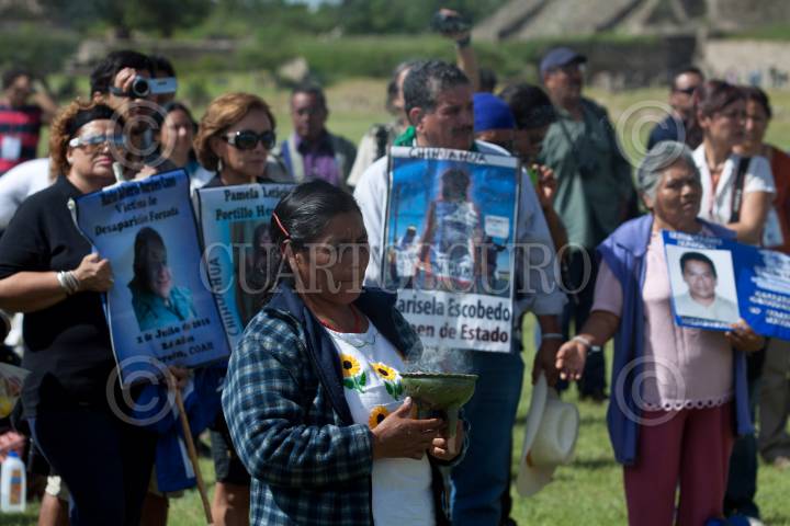 OAXACA, OAXACA, 12SEPTIEMBRE2011.- Victimas de la violencia que marcha con la caravana al Sur encabezada por el poeta Javier Sicilia arribaron esta mañana a Monte Alban en donde se realizo una ceremonia prehispanica y se entrego el bastón de mando. FOTO: RODOLFO ANGULO/CUARTOSCURO.COM