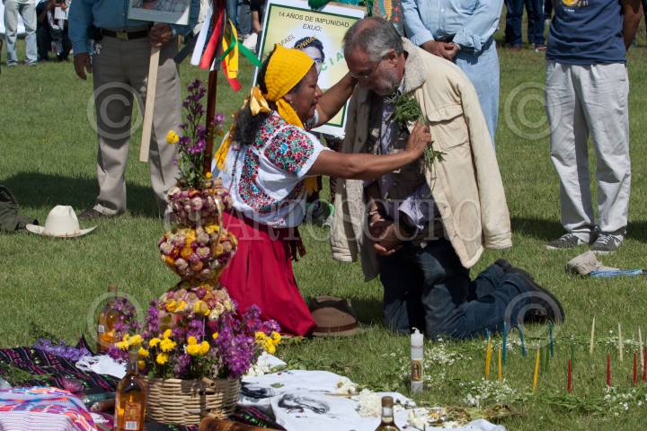 OAXACA, OAXACA, 12SEPTIEMBRE2011.- Victimas de la violencia que marcha con la caravana al Sur encabezada por el poeta Javier Sicilia arribaron esta mañana a Monte Alban en donde se realizo una ceremonia prehispanica y se entrego el bastón de mando. FOTO: RODOLFO ANGULO/CUARTOSCURO.COM