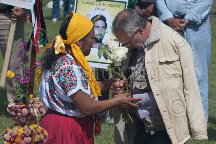 OAXACA, OAXACA, 12SEPTIEMBRE2011.- Victimas de la violencia que marcha con la caravana al Sur encabezada por el poeta Javier Sicilia arribaron esta mañana a Monte Alban en donde se realizo una ceremonia prehispanica y se entrego el bastón de mando. FOTO: RODOLFO ANGULO/CUARTOSCURO.COM