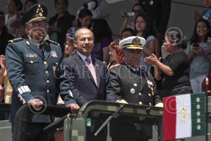 MÉXICO D.F., 14SEPTIEMBRE2011.- Guillermo Galvan Galva, Secretario de la Defensa junto a Felipe Calderon, Comandante Supremo de las Fuerzas Armadas de México y Francisco Saynez, Secretario de Marina y Armada de México durante la Ceremonia de Clausura y Apertura de Cursos del Sistema Educativo Militar misma que tuvo lugar en el Colegio Militar de la ciudad. FOTO: ENRIQUE ORDÓÑEZ/CUARTOSCURO.COM