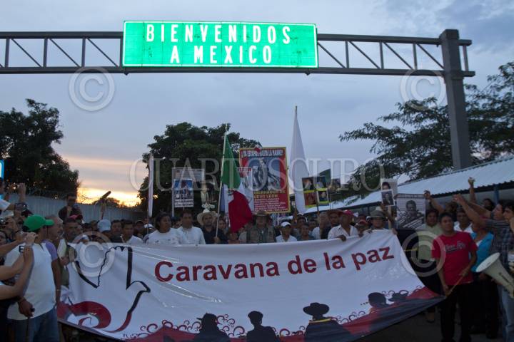 CIUDAD HIDALGO, CHIAPAS,14SEPTIEMBRE2011.- El poeta Javier Sicilia acompañado de Julian LeBaron y miembros de la Caravana al Sur del Movimiento por la Paz con Justicia y Dignidad se encontraron con miembros de organizaciones guatemaltecas en donde realizaron un mitin sobre el puente fronterizo entre Cd. Hidalgo, Chiapas y Tecún Umán, Guatemala. FOTO: RODOLFO ANGULO/CUARTOSCURO.COM