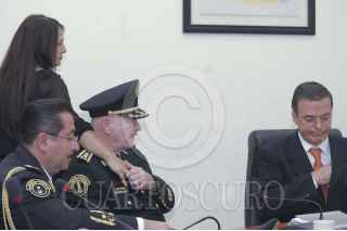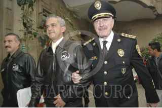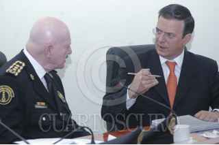 MÉXICO D.F., 15SEPTIEMBRE2011.- Manuel Mondragón, Director de la Policia del Distrito Federal y Marcelo Ebrard, Jefe de Gobierno, presentaron en conferencia de prensa el operativo de seguridad que con motivo de el grito de Independencia se llevará acabo en el zócalo caputalino y las 16 delegaciones la noche de hoy. FOTO: FRANCISCO RODRÍGUEZ/CUARTOSCURO.COM