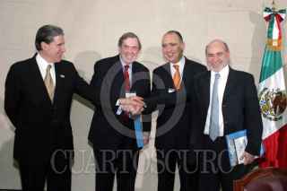 MEXICO, D.F. 03NOVIEMBRE2004.- Julio Frenk Mora, Secretario de Salud, Donald J. Johnston, Secretario General de la OCDE, Fernando Canales Clarion, Secretario de Economía y Eduardo Sojo, Jefe de la Oficina de Políticas Públicas de la Presidencia; inauguraron el Foro de Políticas Públicas para un Mejor Desempeño Económico, organizado en la sede de la Secretaría de Relaciones Exteriores. FOTO: Moisés Pablo/CUARTOSCURO.COM