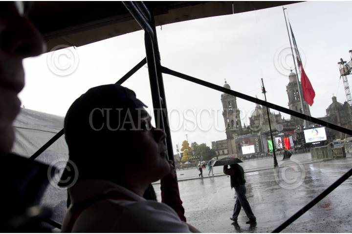 MÉXICO, D.F., 15SEPTIEMBRE2011.- Personas se protejen de la lluvia esta tarde previo a la celebración del grito de Independencia que dará el presidente de México, Felipe Calderón Hinojosa. FOTO: MISAEL VALTIERRA/CUARTOSCURO.COM