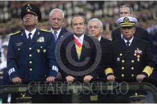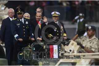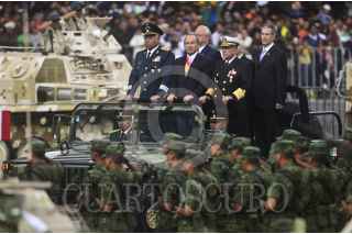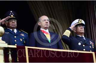 MÉXICO D.F., 16SEPTIEMBRE2011.- Guillermo Galván Galván, secretario de la Defensa Nacional; Felipe Calderón Hinojosa, presidente de México y Francisco Saynez Mendoza, secretario de Marina Armada de México durante el desfile militar en conmemoración al CCI aniversario de la gesta de Independencia, donde elementos de la Secretaria de Marina, Ejercito Mexicano y Policía Federal, pasaron revista en el zócalo capitalino. FOTO: MISAEL VALTIERRA/CUARTOSCURO.COM