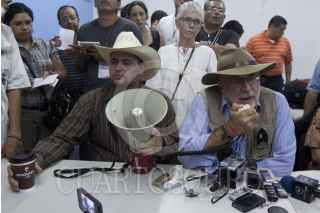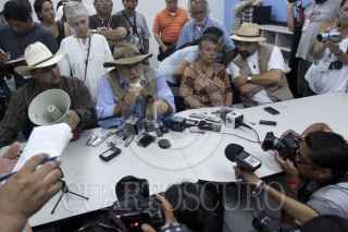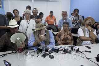 COATZACOALCOS, VERACRUZ, 18SEPTIEMBRE2011.- El poeta Javier Sicilia acompañado de Julian LeBaron, Tere Carmona y de Emilio Alvarez Icaza, integrantes del Movimiento por la Paz con Justicia y Dignidad ofreció esta mañana una conferencia de prensa acerca de los acontecimientos regisrados anoche en el kilometro 86 autopista Villahermosa - Coatzacoalcos en donde recibieron una alerta para aplicar un protocolo de seguridad como medida de protección ante una posible emboscada. FOTO: RODOLFO ANGULO/CUARTOSCURO.COM
