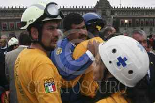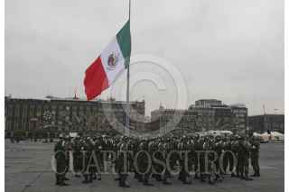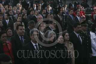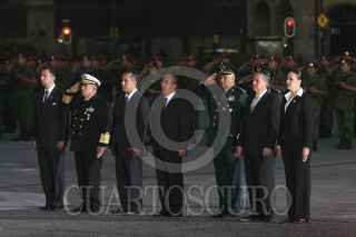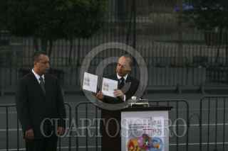 MÉXICO, D.F., 19SEPTIEMBRE2011.- Felipe Calderón Hinojosa, presidente de México con parte de su gabinete federal, rescatistas y familiares de víctimas del terremoto de 1985, realizaron una guardia de honor en la plancha del Zócalo capitalino para conmemorar el 26 aniversario del terremoto. Posteriormente canceló el timbre postal del sistema nacional de protección civil y entregó premios al mérito en materia de prevención y atención a los desastres naturales. FOTO: SAÚL LÓPEZ/CUARTOSCURO.COM