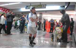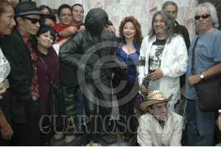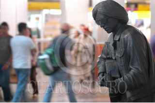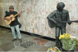 MÉXICO, D.F., 19SEPTIEMBRE2011.- El día de hoy se inauguró la estatua del músico Tamaulipeco, Rodrigo González, mejor conocido como "Rockdrigo" en el anden de transferencia de la estación del metro Balderas en el marco de su XXVI aniversario luctuoso. Gerardo, un músico urbano llegó tarde a la develación, sin embargo nada le impidió "hecharse el palomazo" con "No tiengo tiempo de cambiar mi vida" FOTO: FRANCISCO RODRÍGUEZ/CUARTOSCURO.COM