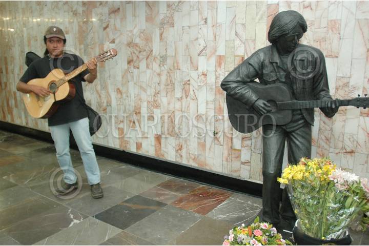 MÉXICO, D.F., 19SEPTIEMBRE2011.- El día de hoy se inauguró la estatua del músico Tamaulipeco, Rodrigo González, mejor conocido como "Rockdrigo" en el anden de transferencia de la estación del metro Balderas en el marco de su XXVI aniversario luctuoso. Gerardo, un músico urbano llegó tarde a la develación, sin embargo nada le impidió "hecharse el palomazo" con "No tiengo tiempo de cambiar mi vida" FOTO: FRANCISCO RODRÍGUEZ/CUARTOSCURO.COM