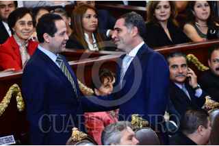 MÉXICO, D.F., 20SEPTIEMBRE2011.- Eruviel Ávila Villegas, gobernador del Estado de México, saluda a Gabino Cué Monteagudo, gobernador de Oaxaca durante su asistencia al V Informe de Gobierno de Marcelo Ebrard Casaubón, que se realizó en la Asamblea Legislativa del Distrito Federal ante la asistencia de personalidades de la política mexicana. FOTO: MISAEL VALTIERRA/CUARTOSCURO.COM