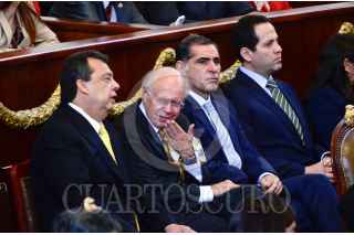 MÉXICO, D.F., 20SEPTIEMBRE2011.- Ángel Aguirre, gobernador de Guerrero; José Narro Robles, rector de la UNAM; Gabino Cué Monteagudo, gobernador de Oaxaca y Eruviel Ávila Villegas, gobernador del Estado de México, durante su asistencia al V Informe de Gobierno de Marcelo Ebrard Casaubón, que se realizó en la Asamblea Legislativa del Distrito Federal ante la asistencia de personalidades de la política mexicana. FOTO: MISAEL VALTIERRA/CUARTOSCURO.COM