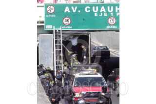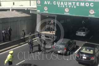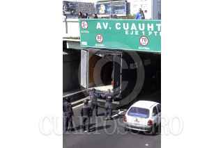 MÉXICO, D.F., 20SEPTIEMBRE2011.- Un camión de la Policía Federal se atoró en el puente desnivel en viaducto y Cuauhtémoc donde se desprendió todo el techo del camión ocasionando un gran tráfico. FOTO: LUIS CARBAYO/CUARTOSCURO.COM