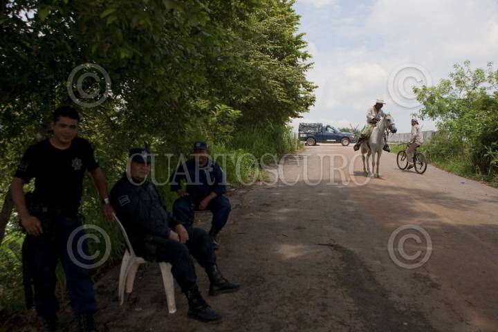 MACUSPANA, TABASCO, 22SEPTIEMBRE2011.- Las lluvias de los últimos días en el río Tulijá se encuentra en su máximo nivel y en varias localidades ha desbordado; lo que representa un riesgo de consideración debido a esto fue cerrado a todo vehículo el paso por su puente, el cual es resguardado por elementos de seguridad pública municipal. Dicho puente dejó incomunicado al menos a ocho poblados y con el municipio de Jonuta. FOTO: MARCO POLO GUZMÁN HERNÁNDEZ/CUARTOSCURO.COM