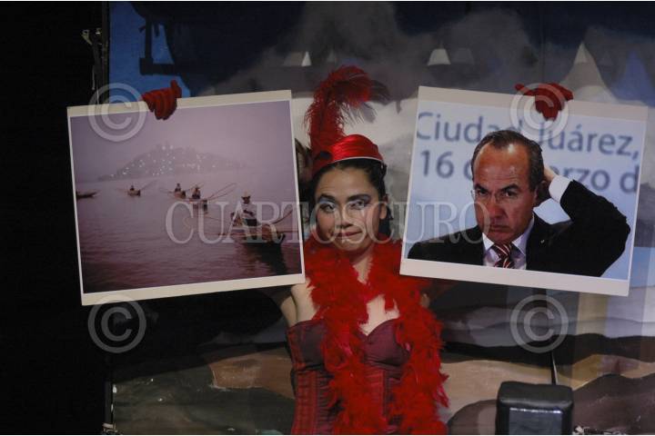 MÉXICO D.F., 24SEPTIEMBRE2011.- Los actores Ix-chel Muñoz, becaria del FONCA "Creadores Escénicos" es "Rosita", Felipe Rodríguez quien interpreta a "El Fotógtrafo" y Lizeth Rondero tambien becaria del FONCA es "Martina" actuan en la obra de teatro "El país de las Metrallas o ratatatataplán" de Felipe Rodríguez y que esta inspirada en un texto de 1913 "El país de la Metralla" de José F. Elizondo. la obra se presenta todos los sábados en el teatro Isabela Corona a un costado de la plaza de las tres culturas en Tlatelolco. FOTO: FRANCISCO RODRÍGUEZ/CUARTOSCURO.COM