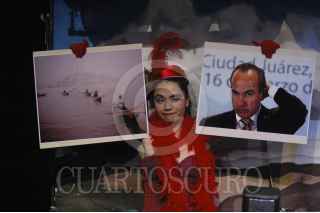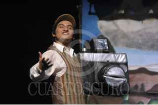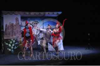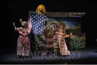 MÉXICO D.F., 24SEPTIEMBRE2011.- Los actores Ix-chel Muñoz, becaria del FONCA "Creadores Escénicos" es "Rosita", Felipe Rodríguez quien interpreta a "El Fotógtrafo" y Lizeth Rondero tambien becaria del FONCA es "Martina" actuan en la obra de teatro "El país de las Metrallas o ratatatataplán" de Felipe Rodríguez y que esta inspirada en un texto de 1913 "El país de la Metralla" de José F. Elizondo. la obra se presenta todos los sábados en el teatro Isabela Corona a un costado de la plaza de las tres culturas en Tlatelolco. FOTO: FRANCISCO RODRÍGUEZ/CUARTOSCURO.COM